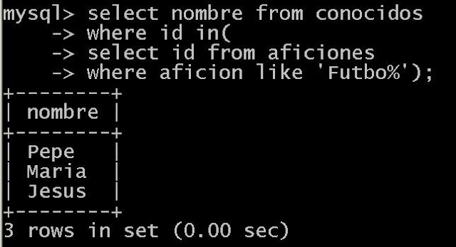 En este caso a diferencia de la consulta anterior, la información que queremos obtener (la afición) y el dato por el que queremos filtrar ("Pepe") están en tablas distintas.